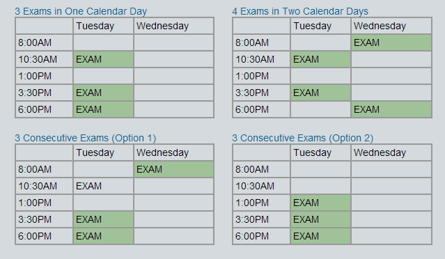 - 3 finals in consecutive time blocks spanning parts of two consecutive days